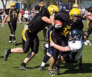 Fulda. (27.Mai.12/ y4u) Das war so kaum zu erwarten, der Aufsteiger mischt die Oberliga auf, ist derzeit einfach nicht zu stoppen. Die Erfurt Indigos feierten am Pfingstsonntag ihren vierten Sieg im vierten Spiel, lösten die Pflichtaufgabe souverän. Sie gewannen bei den noch sieglosen Fulda Saints deutlich mit 45:8 und führen mit 8:0 Punkten die Tabelle der Staffel Nord an. Vor rund 100 Zuschauern auf dem Sportplatz der Sturmiusschule erwischten die Erfurter den besseren Start. Erfurts Runningback Jan Streibel sorgte mit seinem Touchdown für die ersten Punkte und Alexander Wyrfel erhöhte per PAT auf 7:0. Auch im zweiten Quarter machten die Gäste die ersten Punkte. Diesmal marschierte Tilman Brütsch in die Endzone der Hausherrenlagen und Würfel war anschließend zum 14:0 erfolgreich. Danach nahmen auch die Saints am Spiel teil, verkürzten per Touchdown und two-Point-Conversion zum zwischenzeitlichen 8:14. Doch das sollten die einzigen Punkte der Gastgeber bleiben, ließ die gute Erfurter Defense keine weiteren Punkte der Hessen zu. Dafür bauten die Indigos ihren Vorsprung durch ein Fieldgoal von Wyrfel sowie Frank Beckers Touchdown auf 8:24 bis zur Halbzeitpause aus. In den beiden Schlussquartern ging es nur noch um die Höhe des Ergebnisses, Fulda war nicht in der Lage dem Spiel noch einmal eine Wende zu geben. Die Erfurter tauchten noch dreimal in der Endzone der Saints auf, legten so 21 Zähler durch Wide Receiver Steffen Willing, er war zweimal erfolgreich und Runningback Frank Becker sowie die zugehörigen PAT’s von Alexander Wyrfel nach. In zwei Wochen können die Indigos im Rückspiel gegen die Hessen auf eigenem Platz ihre Erfolgsserie fortsetzen.