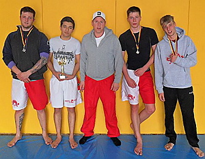 Sangerhausen. (07.Apr.12/ csc) Am Samstag nahm die Grapplingmanschaft des CSC-Erfurt am Oster Break Down des befreundeten Ludus Magnus Gym in Sangerhausen teil. Dies sollte der erste Wettkampf dieser Art für Sportler des Contact Sports Club Erfurt sein. Angemeldet hatten sich zu diesem Turnier ca. 30 Kämpfer. Leider erschienen diese nicht wie geplant. So wurde es "nur" ein Kräftemessen zwischen Kämpfern aus Sangerhausen und der Mannschaft des CSC um Coach Karsten Seyfarth. Nach vorheriger Absprache wurden die Kämpfer in zwei Klassen aufgeteilt. Gekämpft wurde ohne Zeitlimit. Hier zählten die Punkte, neun zum Sieg, bzw. die Fähigkeit, eine Submission anzusetzen. In der leichten Gewichtsklasse waren zwei Kämpfer vom Team Ludus Magnus sowie Elschad Behbudov und Christian Geyer vom CSC-Erfurt. Den ersten Platz sicherte sich hier der erst 17-jährige Elschad. Den zweiten Platz belegte Christian Geyer. In der schweren Gewichtsklasse traf Toni Lippe vom CSC-Erfurt auf den erfahrenen Maik Kiesel vom Ludus Magnus Team. Toni lag nach rund fünf Minuten punkte mäßig zurück. Kiesel brauchte nur noch einen Punkt zum Sieg. Doch nach acht hart gekämpften Minuten schaffte es Toni, aus dem 8:1-Rückstand einen 8:9-Sieg zu machen. Stefan Kummer traf als erstes auf den rund 20 kg schwereren Ringer Franz Stöttige. Dieser setzte sein ringerisches Können und seinen Gewichtsvorteil gekonnt ein und lies dem Kämpfer vom CSC keine Chance. Auch Toni konnte dem Gewichtsunterschied nichts entgegen setzten. In der schweren Gewichtsklasse belegte Stefan Kummer den zweiten Platz und der 17-jährige Toni Lippe musste sich trotz souveräner Leistung mit einem dritten Platz zufrieden geben. Trainer Karsten Seyfarth ist vorerst zufrieden mit dem Abschneiden seiner "Jungs", doch war dies nur ein kleines Turnier. Für größere Wettkämpfe ist definitiv eine noch intensivere Trainingsbereitschaft der Wettkämpfer nötig.