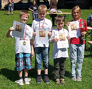 Breitungen. (01.Aug.12/ Stefan Taudte) Die Thüringer Schach-Mannschaftsmeisterschaften in den Altersklassen U10 und U14 wurden von der SG Barchfeld/ Breitungen im Schloss Breitungen ausgerichtet. Beide Turniere wurden offen durchgeführt. Man musste sich also nicht für die Meisterschaft qualifizieren, sondern jeder Verein konnte teilnehmen. Bei den Jüngsten starteten acht Mannschaften, davon kamen gleich drei Teams vom SV Empor Erfurt. Die Emporratten wollten als Seriensieger natürlich den Titel aus 2011 verteidigen. Mit Philipp Wolf (Nr.1 der Thüringer U10-Bestenliste) und Hannah Geletzke (Thür. Vizemeisterin U10w) waren auch noch 2 Spieler aus dem Vorjahresteam dabei. 2011 wurde die Mannschaft nicht nur souverän Bezirks- und Thüringenmeister, sondern von den Zeitungslesern der TA und TLZ sogar zum Publikumsliebling des Erfurter Sport gewählt. Komplettiert wurde das Favoritenteam durch den erst 8-jährigen Moritz Weishäutel und Daniel Finke (Thür. Vizemeister U10). Und die Landeshauptstädter trumpften überzeugend auf. Lediglich gegen den Mitfavoriten VfL 1990 Gera wurde es spannend. Diesen Spitzenkampf gewann Empor mit etwas Glück 2,5:1,5. Alle anderen Mannschaftskämpfe gingen klar an der Emporianer. Mit 10:0 Mannschaftspunkten und 16,5:3,5 Brettpunkten holten sich die Erfurter souverän den U10-Landesmeistertitel vor dem MTV 1876 Saalfeld (8:2) und dem VfL 1990 Gera (7:3). Auch 3 der 4 Auszeichnungen für die Besten Spieler an den Brettern 1 bis 4 holten sich die Emporratten: Philipp Wolf (4:1 am 1. Brett), Daniel Finke (4,5:0,5 am 3.Brett) und Hannah Geletzke (5:0 ! am 4.Brett). Auch der Jüngste im Team, Moritz Weishäutel, schlug sich mit 3:2 Punkten am 2.Brett richtig gut. Zwei knappe Niederlagen gegen Saalfeld und Gera verhinderten einen Medaillenplatz für die 2. Mannschaft des SV Empor Erfurt. Aber auch über den fünften Platz können Etienne Roché Ries (2:3), Konstantin Schneider (2:3), Thorben Niebur (3,5:1,5) und Julius Lindenlaub (2:3) stolz sein. Leider konnte die dritte Empor-Mannschaft nur zu dritt antreten, so dass es in jeden Kampf bereits mit einem 0:1-Rückstand ging. Um so überraschender der starke sechste Platz für Bruno Fehse Romero (2:3), Paul Schulze (2:3) und Vincent Kazuch (3:2). Von 2008 bis 2010 ging der Thüringer Meistertitel U14 jeweils an den SV Empor Erfurt. Nach dem „Ausrutscher“ im Vorjahr, als die Emporratten „nur“ Dritter wurden, sollte diesmal wieder der Titel her. Doch leider fehlten mit Alina Zahn (Nr. 1 der Thüringer U14-Bestenliste – bei den Jungen!) und Alexander Allin (Nr.9) gleich zwei Top-Spieler, so dass Empor in der Setzliste nur auf Platz zwei hinter dem SV Breitenworbis lag. Aber das stachelte die Erfurter wohl noch zusätzlich an, denn vor allem Tim Nicolai und Jan Sommer an den beiden Spitzenbrettern ließen mit 4,5 bzw. 5 Punkten aus den 5 Partien nichts anbrennen. Damit wurden sie natürlich auch als beste Spieler am 1. und 2. Brett ausgezeichnet. Oliver Dönicke und Florian Merx steuerten 2 bzw. 3 Punkte zum Mannschaftserfolg bei. Die Erfurter gewannen alle 5 Mannschaftskämpfe und hatten am Ende drei Punkte Vorsprung auf die Verfolger. Lars Urban und Tim Nicolai standen vor einigen Wochen gemeinsam im Siegerteam bei der Thüringer Mannschaftsmeisterschaft U16. Diesmal überzeugte Lars Urban als Trainer, der seine U14-Mannschaft immer hervorragend auf die nächsten Gegner einstellte. Und Tim Nicolai ließ sich am Spitzenbrett nicht die Butter vom Brot nehmen und sicherte sich den zweiten Thüringer Titel in diesem Jahr. Um Platz zwei musste die dritte Wertung zwischen dem SSV Vimaria Weimar und dem SV Breitenworbis entscheiden, da beide Teams 7:3 Mannschafts- und 14:6 Brettpunkte auf ihrem Konto hatten. Die Weimarer hatten hier die Nase knapp vorn. Die zweite Mannschaft des SV Empor Erfurt bestand komplett aus U12-Spielern und kam nicht über den sechsten und letzten Platz hinaus. Aber Lotta Rieger (1:4), Viggo Becht (0:5), Martin Berna (0,5:4,5) und Karl Sattler (1:4) zeigten gegen die älteren Gegner zum Teil schon recht ansprechende Partien. Empor Erfurt unterstrich mit diesen beiden Titelgewinnen eindrucksvoll seine Spitzenstellung im Thüringer Nachwuchsschach. Die Thüringer Mannschaftstitel in den Altersklassen U16 und U20w gewannen die Emporratten ebenfalls in diesem Jahr. Vier der sieben ausgespielten Thüringer Mannschaftsmeister im Nachwuchsbereich gingen 2012 an den SV Empor Erfurt, ein beeindruckendes Ergebnis.