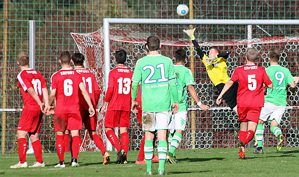 Wolfsburg. (16.Apr.16/ y4u) Ohne Punkte blieben die U19-Junioren des FC Rot-Weiß Erfurt am 23 Spieltag der Bundesliga Nord/Nordost. Die Schützlinge von Marcus Jahn unterlagen beim Tabellenzweiten in Wolfsburg mit 0:2. Während Niedersachsen mit dem dritten Sieg in Folge Boden auf Spitzenreiter Werder Bremen gut machen konnten, treten die Rot-Weißen auf der Stelle, belegen mit 24 Punkten weiter den ersten Abstiegsplatz. „Wir haben sehr geduldig und diszipliniert agiert gegen eine Erfurter Mannschaft, die sehr tief stand und auf Konter gelauert hat. Wir haben wenig zugelassen und unsere Möglichkeiten gut herausgespielt. Am Ende war es ein hochverdienter Erfolg“, ordnete VfL-Coach Hagen Schmidt das Ergebnis ein. Die 110 Zuschauer im Stadion am Alsterweg mussten Geduld mitbringen, bis sie den ersten Treffer geboten kamen. Fünf Minuten vor dem Pfiff zur Halbzeitpause traf Anton Donkor, es war sein achtes Saisontor, zur Führung für die Hausherren. Auch die zweite Halbzeit blieb lange torlos, ehe die Wolfsburger in der 77. Minute durch Orhan Vojic das Spiel endgültig entschieden. Nächsten Sonntag empfangen die Erfurter im Cyriaksgebreit Holstein Kiel zum wichtigen Kellerduell.