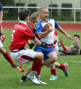 Leipzig. (12.Jul.14/ y4u) Es wird jedes Mal etwas besser. Das Flag-Jugendteam der Erfurt Indigos steigert sich in seiner Premierensaison in der Liga Ost von Spieltag zu Spieltag. Fünf Nachwuchsteams aus Halle, Leipzig, Magdeburg, Wernigerode und Erfurt haben jeweils einmal Heimrecht, spielen in der körperlosen Variante des Football ihren Meister aus. Am dritten Turniertag in Leipzig konnten die Erfurter erstmals eine ausgeglichene Bilanz feiern. Mit zwei Siegen und ebenso vielen Niederlagen landeten sie in der Tagesabrechnung auf Rang drei und gaben in der Gesamtwertung die rote Laterne an die Wernigerode Mountain Tigers ab. Die Indigo-Youngsters startete zwar mit einer 12:21-Niederlage gegen die gastgebenden Leipzig Lions in das Turnier, ließen sich davon aber nicht beeindrucken. In den folgenden Spielen bewiesen sie ihre gewachsene Spielstärke mit einer guten Offenseleistung, hatten aber noch Schwächen in der Defense. Im zweiten Spiel gegen die Magdeburg Virgin Guards gingen sie mit einem 20:13-Erfolg vom Platz. Anschließend schlugen sie auch Wernigerode mit 19:16. Gegen den souveränen Tabellenführer aus Halle war allerdings nichts zu holen, die Falken gewannen klar 31:24. Jetzt haben die Youngster Sommerpause, ehe Anfang September das Turnier in Wernigerode folgt.