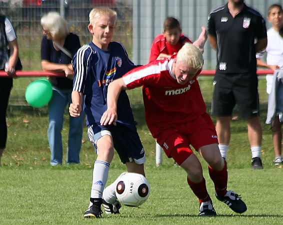 Jena. (05.Dez.12/ y4u) Einen knappen, aber verdienten 2:1-Derbysieg gegen den Erzrivalen aus Jena konnten die U15-Junioren des FC Rot-Weiß Erfurt im letzten Pflichtspiel des Jahres feiern, überwintern in der Regionalliga Nordost mit 25 Punkten auf Rang vier. Die Startphase der Partie ging klar an die Schützlinge von Frank Tanne und Steffen Knäbe. Die Erfurter bestimmten die ersten zwanzig Minuten das Geschehen, ließen keine Chance der Hausherren zu, erspielten sich aber selbst eine Reihe guter Möglichkeiten. In der fünften Minute landete der Ball nach einem Freistoß von Julian Weigel am Aluminium, den Abpraller beförderte Elias Isert zur Führung über die Linie. Nur zwei Minuten später legten die Rot-Weißen nach. Björn Hädicke kam im Strafraum frei zum Schuss, erhöhte zum 2:0-Halbzeitstand. Nach dem Seitenwechsel machten die Gastgeber Druck und wurden belohnt. Sieben Minuten nach Wiederanpfiff traf Max Machleb zum Anschluss. Anschließend drängten beide Teams auf die Entscheidung, konnten aber ihre heraus gespielten Möglichkeiten aber nicht nutzen. So lagen sich am Ende die Rot-Weißen erschöpft, aber glücklich in den Armen.